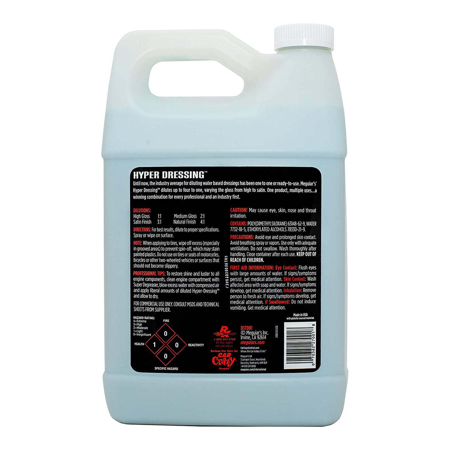 Meguiar's Hyper Dressing este o solutie profesionala de intretinere pentru suprafetele interioare si exterioare din cauciuc, plastic si vinil. Ofera flexibilitate maxima prin posibilitatea de diluare in diverse concentratii, permitand obtinerea aspectului dorit – de la mat natural pana la luciu intens.